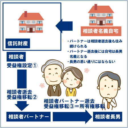 ご自身を委託者兼第一受益者、会社を受託者、第二受益者を交際相手、第三受益者を長男として、自宅不動産を信託財産とする信託契約を締結するのがオススメです。その際、金銭や有価証券等については長男に相続させる旨の遺言書を書いておくとよいでしょう。そうすると、ご自身が亡くなった後、自宅不動産の受益権が一旦は交際相手に移動しますが、交際相手が死亡した後は、その交際相手の相続人は遺留分侵害額請求ができませんので、自宅不動産の所有権は長男に移動し、いわば戻ってくることになります。また、受託者を会社とすることによって、会社の後継者となる長男が状況を把握しておくこともできるので、その点においても長男の安心材料となることでしょう。