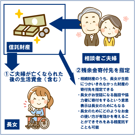 お父様が委託者兼第一受益者、お母様が第二受益者、そして娘さんを第三受益者とし、どなたか信頼できる第三者に受託者となっていただいて信託契約を締結するのはいかがでしょうか。信託契約書で、第三受益者である娘さんが亡くなった後の残った財産をどこに帰属するかを指定しておくのです。この帰属先としてお世話になった施設や援助してくださった方々等を指定することができます。これにより、障がいを持つ娘さんに対するご両親の想いだけでなく、娘さんを支援してくださった方々への感謝の気持ちも実現することが可能となります。この場合の受託者は親戚等でも構いませんが、娘さんはまだお若いようですので、娘さんが生涯を終えるまでの数十年間、しっかりと娘さんを支え、かつ娘さんが亡くなった後の信託内容をきちんと実行できる方である必要があります。そのため、受託者としては、任意後見を多数引き受けている社団法人、NPO法人といった非営利団体など、組織として対応できる先を定めるのが望ましいでしょう。