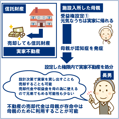 お母様が元気なうちに、お母様を委託者兼第一受益者、ご自身を受託者兼第二受益者とする信託契約を締結するのがオススメです。お母様は、施設に入所後も時々帰宅して掃除をしたり、泊まりたいときに泊まったりすることができます。そして、徐々にお母様の意思判断能力が低下し判断できなくなった場合には、信託の目的や権限の範囲内で、ご自身がその不動産を処分したり、賃貸に出すことも可能になります。これまでは、成年後見制度を利用しなければ、認知症になった後の実家の売却は難しく、万一売却できたとしてもその後ずっと成年後見制度を利用し続けなければいけませんでしたが、この信託契約という制度を利用することで、柔軟な対応が可能となります。また、ご実家の売却代金はお母様のものですので、お母様のために有効に使うことができます。