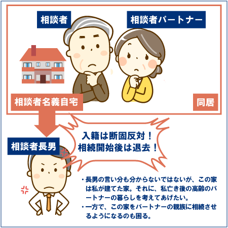もし今のままの状態で相続が発生すると、財産は全て長男のものとなり、交際相手が自宅に住み続けることは難しくなります。