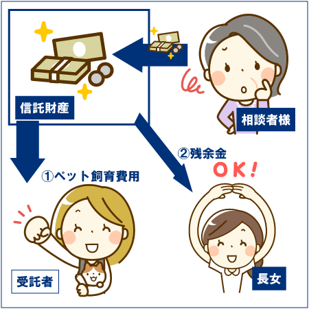 まずは、ご自身が仲良くされているペット仲間など第三者にご自身のペットの行く末を見守っていただけるようお願いしてみてはいかがでしょうか。ご自身を委託者兼第一受益者、娘さんを第二受益者、ペット仲間を受託者として、ペットと今後ペットの飼育のために必要になるであろう飼育費を信託財産として信託契約を締結します。もし何かあってご自身がペットを飼えなくなった場合、受託者に動物愛護施設や老犬ホーム等にペットの飼育を依頼してもらい、その費用を信託財産の中から支払ってもらいます。そして、最終的にペットが亡くなった後に残った財産は、第二受益者である娘さんが受け取ります。そうすることで、ご自身だけでなく、ペットも安心して天寿を全うすることができるのではないでしょうか。