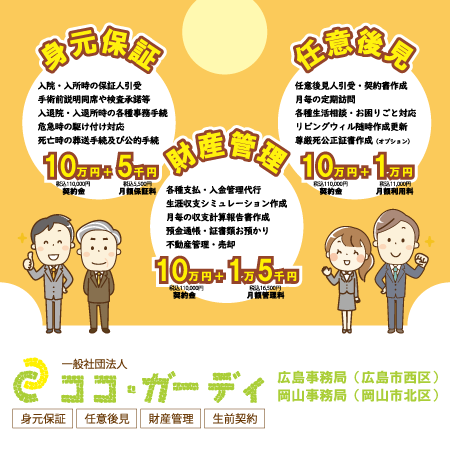 一般社団法人ココ・ガーディは、より多くの高齢者の方が安心してサービスを受けることができること、そして、そんな高齢者の方々を支える様々な分野の方々のバックアップを目的として設立されています。サービス利用料等についても柔軟な対応を行っていますので、老後のお困りごとに直面されている方は是非一度ご相談されてみてください。