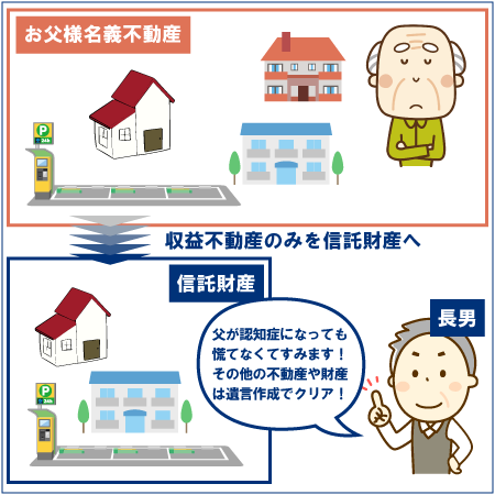 アパートや駐車場、借家の所有者であるお父様を委託者兼受益者、ご自身を受託者として信託契約を締結するのはいかがでしょうか。家賃などの利益を受け取る権利はお父様ですが、アパート等の管理は受託者であるご自身が行います。もし将来、お父様が意思判断能力を失うような事態に陥った場合、今度は受託者であるご自身が明確な財産の管理処分権限を持って、賃貸借契約はもとより、大規模修繕や建替え、もしくは売却といった行為を行うことが可能です。
